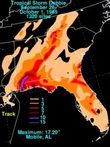 - 1 2 3 David M. Roth (2009-04-12). "Tropical Storm Debbie - September 26-October 1, 1965". Hydrometeorological Prediction Center. Retrieved 2011-10-20.