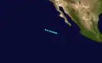 The last tropical cyclone of the season, Tropical Storm Tillie, developed on September 7. At first, the cyclone moved north-northwest;[3] Tillie reached its peak intensity of 60 mph (95 km/h) at that time of its formation approximately 150 mi (240 km) west of Mazatlan.[5] Early on September 8, while located about 100 mi (160 km) southwest of Cabo San Lucas, Tillie began a gradual turn towards the west-northwest. Tropical Storm Tillie dissipated at 0600 UTC on September 9[3] off the coast of California,[9] having only been a tropical cyclone for just over two days.[3]