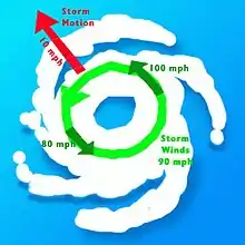 The strongest winds in a northern hemisphere tropical cyclone is located in the eyewall and the right front quadrant of the tropical cyclone. Severe damage is usually the result when the eyewall of a hurricane, typhoon or cyclone passes over land. The right front quadrant is also an area of a tropical cyclone were the winds are strongest. The reason that the winds are at the front right side of a storm in the northern hemisphere (and the front left hand side in the Southern Hemisphere) is because of the motion of a tropical cyclone contributing to its rotation. A 100 mph hurricane while stationary, might have winds of 100 mph on its right side in the northern hemisphere while the rest of the storm might have winds at 70 mph. The location of the right (or left in the Southern Hemisphere) front quadrant also depends on the storm track. For example, in the northern hemisphere, if the storm was moving west, then the right side is to the north, if it moving north, then the strongest winds will be to the east of the center. [5]