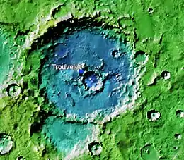 Trouvelot is a crater on Mars, located in the Oxia Palus quadrangle at 16.2° north latitude and 13.1° west longitude near the crustal dichotomy in the circum-Chryse region. It is roughly located along the dichotomy between Arabia Terra to the northeast and the southernmost of the circum-Chryse outflow channels to the southwest. Trouvelot crater measures approximately 148.77 kilometres (92.44 mi) in diameter and was named after Étienne Léopold Trouvelot, a French astronomer (1827–1895). The name was adopted by IAU's Working Group for Planetary System Nomenclature in 1973.[1]