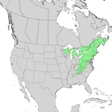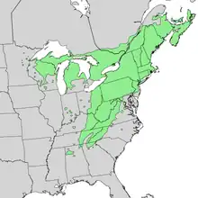 T. canadensis occurs at sea level in the north of its distribution,[10] but is found primarily at elevations of 600–1,800 m (2,000–5,900 ft). It ranges from northeastern Minnesota eastward through southern Quebec and into Nova Scotia, and south in the Appalachian Mountains to northern Georgia and Alabama.[5][12] Disjunct populations occur in the Piedmont region, northern Alabama, western Ohio and into Indiana, as well as western Wisconsin and eastern Minnesota.[10][13] In Canada, it is present in Ontario and all provinces to the east except Newfoundland and Labrador.[5] Its range completely overlaps that of the closely related Tsuga caroliniana.[14]