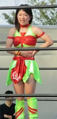 In December 2009, Tsukushi, then only twelve years old, and nine-year-old Kurumi began training professional wrestling under Emi Sakura at her promotion Ice Ribbon's dojo in Saitama. Tsukushi's training sessions with Sakura mainly took place on weekends, while on weekdays she remained in her hometown of Kamisu, training amateur wrestling with a local male junior high school wrestling team.[1] In January 2010, Tsukushi and Kurumi were entered into a trial series, which saw them both compete in three-minute time limit matches at Ice Ribbon events with those in attendance being given the right to vote on which one should be made a permanent member of the roster; the first to reach 500 votes would win the series.[6] Tsukushi made her professional wrestling debut on January 16, when she wrestled Chii Tomiya to a three-minute time limit draw.[5] During the next two months, Tsukushi also wrestled Emi Sakura twice,[7][8] Mai Ichii three times,[9][10][11] and Chii Tomiya and Hamuko Hoshi both once to a time limit draw,[12][13] before suffering her first loss on March 6, against Miyako Matsumoto.[14] On March 13, Tsukushi and Kurumi were defeated in a tag team match by Chii Tomiya and Riho.[15] After the match it was announced that Tsukushi had won the trial series 506 fan votes to 379 and had as a result earned the right to become a member of Ice Ribbon's roster.[15] The following day, she was defeated by Chii Tomiya in her official debut match.[1][16] Tsukushi earned her first win on April 29, when she pinned Tomiya in a tag team match, debuting her finishing maneuver, Harukaze ("Spring Breeze"), in the process.[17] On May 22, Tsukushi broke the record for the fastest win in Ice Ribbon history, when she pinned Emi Sakura in just five seconds.[18] The win earned her a shot at Sakura's ICE×60 Championship, Ice Ribbon's top title, however, she was defeated in the title match on June 5.[19] On July 11, Tsukushi made her debut for the NEO Japan Ladies Pro Wrestling promotion, losing to fellow Ice Ribbon worker Makoto.[20] Tsukushi's first year in professional wrestling ended with her biggest match yet, when she teamed with Natsuki☆Taiyo and Sayaka Obihiro on December 29 in a 24-minute main event, where they were defeated by Emi Sakura, Nanae Takahashi and Yoshiko Tamura.[21]