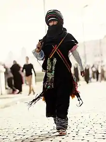 The term for a Tuareg man is Amajagh (variants: Amashegh, Amahagh), the term for a woman Tamajaq (variants: Tamasheq, Tamahaq, Timajaghen). Spellings of the appellation vary by Tuareg dialect. They all reflect the same linguistic root, expressing the notion of "freemen". As such, the endonym strictly refers only to the Tuareg nobility, not the artisanal client castes and the slaves.[22] Two other Tuareg self-designations are Kel Tamasheq (Neo-Tifinagh: Kel Tamasheq), meaning "speakers of Tamasheq", and Kel Tagelmust, meaning "veiled people" in allusion to the tagelmust garment that is traditionally worn by Tuareg men.[10]