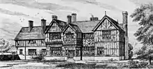 It is entirely half-timbered on a plinth of Ruabon red brick.[1] The bricks for the chimneys and the roof tiles are also from Ruabon. The house is in two storeys and consists of a hall with cross wings, and a two-storeyed porch in the angle of one of the wings. Internally there is a gallery encircling the hall.[2]