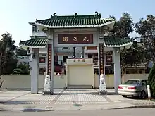 The wall of Tuen Tsz Wai was rebuilt in 1978. The entrance gate of the walled village, originally at the southern end of the central axis, was demolished and a new one was built further east, at the location of a former watchtower. A new permanently closed gate was rebuilt on the site of the former entrance gate as a memorial. The move and reconstruction of the entrance gate are the consequence of the establishment of the Miu Fat Monastery: having a monastery face directly the entrance of a village is considered to have a negative influence on its feng shui.[3][7] The former name of the village, "Tin Tsz Wai" (田子圍) is still inscribed on the former gate. A shrine is located at the northern end of the central axis. It was rebuilt in 1983.[7]