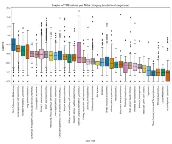 There is a large variation in TMB values across different cancer types as the number of somatic mutations can span from 0.01 to 400 mutations per megabase of genome.[1][10][11] It has been shown that melanoma, NSCLC and other squamous carcinomas have the highest levels of TMB in this order, while leukemias and pediatric tumors have the lowest levels of TMB and other cancers like breast, kidney, and ovary have intermediate TMB values.[10] There is also variation in TMB across different subtypes of different cancers.[10] Due to high variability in TMB across different cancer types and subtypes, it is important to define different cut-offs to have an improved survival prediction and a better treatment decision.[1][10][11] For example, Fernandez et al. showed that TMB can range from 0.03 to 14.13 mutations per megabase (mean=1.23) in TCGA prostate cancer cohort while this range is from 0.04-99.68 mutations per megabase (mean=6.92) in TCGA bladder cancer cohort.[15] A recent study illustrated that different cut-offs are needed for different cancer types to find the patients who can benefit from ICI therapy.[1] In addition, it is crucial to understand that usually there are different clusters of cells in a tumor, known as tumor heterogeneity, that can affect TMB and consequently the response to ICIs.[10] Another factor that can affect TMB is whether the source of the sample is primary or metastatic tissue.[16] Most metastatic samples have been shown to be monoclonal (i.e. there is only one cluster of cells in the tumor), while primary tumors usually consist of a higher number of clusters and have higher overall genetic diversity (more heterogeneous).[16] Scientists have shown that metastatic tumors usually have a higher TMB level compared to primary tumors and this can be due to monoclonal nature of metastatic lesions.[16]