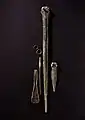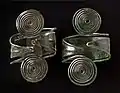 The Bronze Hand of Prêles from Switzerland, dating from the 16th-15th century BC, is a unique find from the Tumulus culture period.[17] Described as "the earliest metal representation of a human body part ever found in Europe",[18] it may have been a ritual object, or mounted on a standard like similar metal hands known from the Iron Age,[19] or possibly a prosthesis.[20] It was found in a grave along with a bronze hair-ring, pin and dagger. The hand had a golden bracelet or cuff decorated with solar motifs.[21]