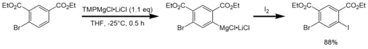 Deprotonation of an aryl containing base-sensitive functionalities and subsequent functionalization with I2 gives the benzene derivative in 88% yield