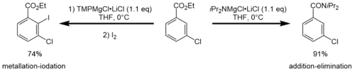 iPr2NMgCl·LiCl can show a different reactivity compared to TMPMgCl·LiCl. Armstrong et al. showed that the TMP-Turbo-Hauser base easily metalates ethyl-3-chlorobenzoate in the C2 position, while the same reaction carried out with the iPr-Turbo-Hauser base resulted in no metalation at all. Instead, an addition-elimination reaction occurs.[5]