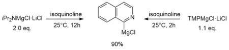 Another difference in reactivity was shown by Krasovskiy et al. with the deprotonation of isoquinoline in THF solution. While TMPMgCl·LiCl required only 2h and 1.1 equivalents, iPr2NMgCl·LiCl needed 12h and 2 equivalents for comparable metalation.[1]