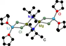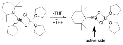 The solid state structure of TMPMgCl·LiCl remains almost completely in THF solution independently of temperature and concentration. Due to the high steric demand of the TMP ligand and its flexible rotation in solution, the THF molecule gets separated from the magnesium cation. The result is an unsaturated magnesium side that could explain the enhanced reactivity and selectivity of TMPMgCl·LiCl.[10]