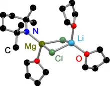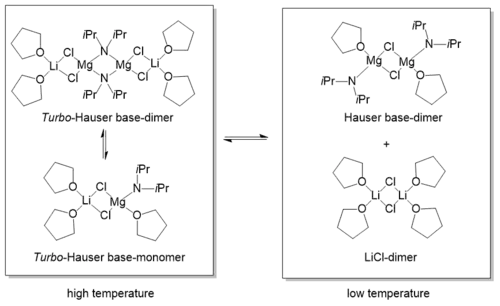 Knochel et al. proposed that LiCl increases the reactivity of Turbo-Grignard compounds RMgCl·LiCl (R = alkyl, aryl or vinyl) by giving the reactive bimetallic monomer a magnesiate character in sense of a solvent separated ion pair (SSIP) [Li(THF)4]+ [RMg(THF)Cl2].[1][11] In case of the above mentioned Turbo-Hauser bases where the alkyl group of a Grignard is replaced by an amido group (R = R'2N) this hypothesis could not be confirmed because no SSIP [Li(THF)4]+ was detectable.