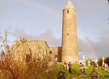In the ninth century an unusual low and squat round tower was constructed at the site.[5]