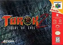 Turok 2: Seeds of Evil is a first-person shooter video game developed by Iguana Entertainment and published by Acclaim Entertainment. It was released for the Nintendo 64 console in 1998 and ported to Microsoft Windows computers in 1999. Seeds of Evil is the second game in the Turok video game series and a sequel to Turok: Dinosaur Hunter. The game follows the story of a Turok and his efforts to stop a powerful alien entity from escaping the confines of his Lightship. A different game set in the same fictional universe, also titled Turok 2: Seeds of Evil, was released for the Game Boy Color alongside the Nintendo 64 game.