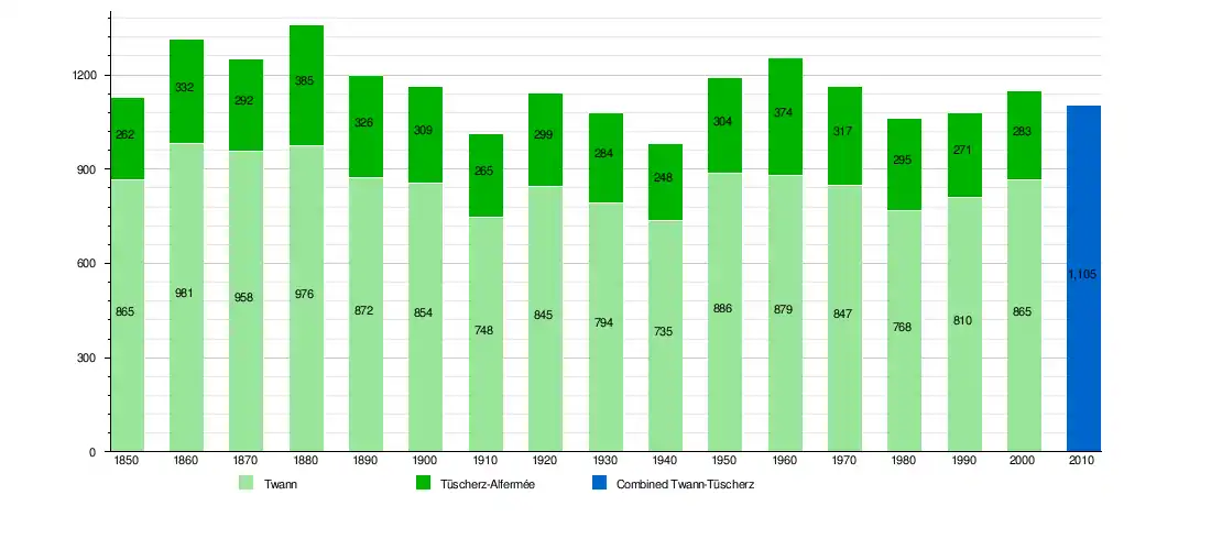 Twann-Tüscherz has a population (as of December 2020) of 1,171.[8] As of 2010, 8.5% of the population are resident foreign nationals. Over the last 10 years (2001-2011) the population has changed at a rate of -1.8%. Migration accounted for -1.7%, while births and deaths accounted for -0.4%.[9]