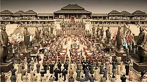 The Twelve Metal Colossi, as depicted in The First Emperor of China (1989). The monumental colossi are shown bordering the avenue leading to the main gate of the Palace.[13]