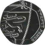 In August 2005 the Royal Mint launched a competition to find new reverse designs for all circulating coins apart from the £2 coin.[6] The winner, announced in April 2008, was Matthew Dent, whose designs were gradually introduced into the circulating British coinage from mid-2008.[7] The designs for the 1p, 2p, 5p, 10p, 20p and 50p coins depict sections of the Royal Shield that form the whole shield when placed together. The shield in its entirety was featured on the now-obsolete round £1 coin. The 20p coin depicts the meeting point of the second and fourth quarter of the shield, showing the lions rampant of Scotland and the lions passant of England. The date no longer appears on the reverse of the coin, and has instead been added to the obverse, where the lettering has been adjusted so as to fit the date in.