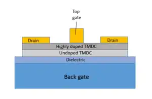 Proposed TMDC-based high-electron-mobility transistor device with top-gated Schottky contact and TMDC layers with different doping levels.[24]