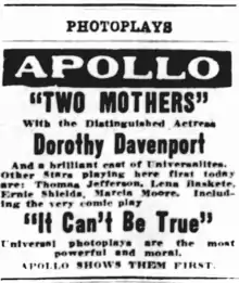 The newspaper ad showing Two Mothers playing along with one other film. The other film was Ernest Shields, Harry Todd and his wife Margaret Joslin starring in the two-reel comedy production of It Can't Be True.[18]