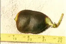 Tylosema esculentum, with common names gemsbok bean and marama bean or morama bean,[2] is a long-lived perennial legume native to arid areas of southern Africa. Stems grow at least 3 metres (9.8 ft), in a prostrate or trailing form, with forked tendrils that facilitate climbing. A raceme up to 25 millimetres (1 in) long, containing many yellow-orange flowers, ultimately produces an ovate to circular pod, with large brownish-black seeds.