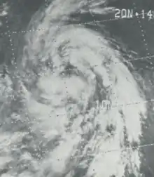 On October 6, 1974, the Joint Typhoon Warning Center (JTWC) began monitoring a tropical disturbance several hundred miles southeast of Guam. Tracking quickly westward to west-northwestward in response to a strong subtropical ridge to the north, the system gradually organized, passing near Ulithi atoll on October 7. Accompanied by a broad monsoonal flow, the disturbance featured multiple centers of circulation. On October 8, it developed into a tropical depression and soon into a tropical storm, at which time it was assigned the name Bess. Early on October 9, an aircraft reconnaissance mission into Bess revealed that a new dominant center of circulation had developed to the north of the original low. The southern low soon dissipated as the northern one became a tropical storm. The northern system retained the name Bess and is considered the same storm by the JTWC.[1]