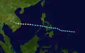 Typhoon Kyle, known in the Philippines as Typhoon Luring, was the first of five deadly tropical cyclones that affected and impacted the Philippines and Vietnam during the 1993 Pacific typhoon season. The twenty-seventh named storm and thirteenth typhoon of the season, Kyle formed from a monsoon depression near Palau, associated with bursts of scattered convection. It then drifted west-northwest, strengthening to a tropical storm the next day. Land interaction prevented further intensification, and it crossed through the central Philippines while maintaining its intensity on November 20. Upon entering the South China Sea, the system strengthened to a severe tropical storm before rapidly intensifying to a typhoon, three days later. It soon reached its peak intensity that day, with one-minute maximum sustained winds of 175 km/h (110 mph), equivalent to a mid-level Category 2 typhoon. It held its strength until landfall in Vietnam later that evening. Weakening through the mountainous terrain of the country, it dissipated near the Cambodia–Thailand border on November 24.