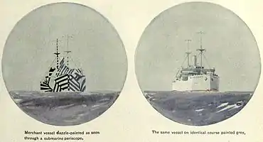Claimed effectiveness: Artist's conception of a U-boat commander's periscope view of a merchant ship in dazzle camouflage (left) and the same ship uncamouflaged (right), Encyclopædia Britannica, 1922. The conspicuous markings obscure the ship's heading.[18]