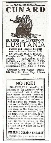 On 7 May 1915, the liner RMS Lusitania was torpedoed by U-20, 13 mi (21 km) off the Old Head of Kinsale, Ireland, and sank in just 18 minutes. Of the 1,959 people aboard, 1,199 were killed, 128 of them US citizens.