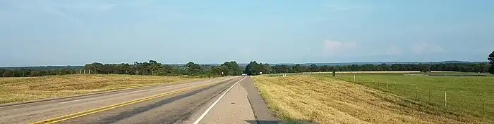 Looking east along the highway just east of the intersection with FM 1892. Anderson County is in the foreground, the Neches River bottom is along the first set of trees, and Cherokee County is in the background.