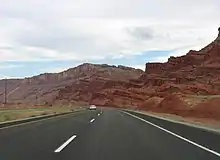 The road from Bluff north via Monticello, Moab, and Valley City to Thompson (a station on the Denver and Rio Grande Railroad) became a state highway in 1910.[7] To connect this road with the rest of the state highway system, a road from Valley City northwest via Floy to Green River was added in 1912, as was a connection from Thompson to via Cisco to Colorado.[8] An extension from Monticello southeast to Colorado was added in 1913,[7] and in the 1920s most of these roadways were assigned numbers: State Route 8 went from Green River via Floy, Valley City, Thompson, and Cisco to Colorado, and State Route 9 began at Valley City and extended south via Moab to Monticello and east to Colorado.[9]