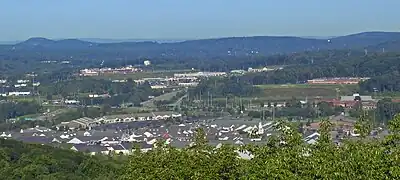 The portion of US 6 in New York east of Fort Montgomery was originally designated as part of NY 37 in the mid-1920s.[7][8] NY 37 began at NY 17 (now NY 17M) in Monroe and followed what is now CR 105 and NY 32 east to Central Valley. From there, it continued to Fort Montgomery via Estrada Road and modern NY 293, NY 218, and US 9W.[8] When the U.S. Numbered Highway System was created on November 11, 1926, there was a gap in US 6 between the New York–Pennsylvania border at Port Jervis and the Connecticut state line east of Brewster.[9] The gap remained in the first official route log published by the American Association of State Highway Officials (AASHO) in 1927; however, US 6 now entered New York at Port Jervis and followed what is now US 209 northeast to Kingston, where the west half of US 6 ended at US 9W. The eastern half of US 6 still began at the Connecticut state line east of Brewster.[2] In 1928, AASHO modified the definition of US 6, placing the route along a new alignment further south in the state in order to eliminate the gap in the designation.[2] It now followed a previously unnumbered highway from Port Jervis to Slate Hill and overlapped with the preexisting NY 8 from Slate Hill to Middletown and NY 17 (modern NY 17M) between Middletown and Monroe. From Monroe to Brewster, US 6 replaced NY 37.[10][11] The former routing of US 6 between Port Jervis and Kingston became US 6N.[2] US 6 was realigned again c.1934 to bypass the U.S. Military Academy to the south. Its former alignment through the grounds became NY 293.[12][13]