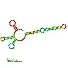 The predicted secondary structure of U12 RNA is published,[2]. However, the alternative single hairpin in the 3' end shown here seems to better match the alignment of divergent Drosophila melanogaster and Arabidopsis thaliana sequences.[3] The sequences U12 introns that are spliced out are collected in a biological database called the U12 intron database.
