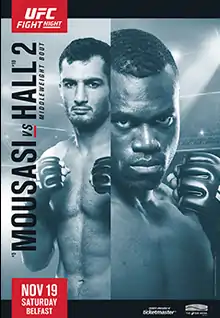 UFC Fight Night: Mousasi vs. Hall 2 (also known as UFC Fight Night 99) was a mixed martial arts event produced by the Ultimate Fighting Championship that was held on 19 November 2016 at The SSE Arena in Belfast, Northern Ireland[2]