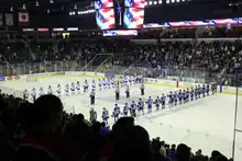 The university's men's hockey team plays in the Hockey East Association and plays its home games at the Tsongas Center at UMass Lowell. In 2013, the men's hockey team won the Hockey East regular-season and tournament championships and advanced to the NCAA Division I Championship "Frozen Four," all for the first time in the university's history.[6] The men's hockey team repeated as Hockey East champions in 2014 while advancing to the NCAA Division I Men's Ice Hockey Championship for the third straight year and sixth time overall. Goalie Connor Hellebuyck is the only Hockey East player to receive the league tournament's Most Valuable Player Award in two consecutive years, earning the honor in 2013 and 2014.[6]