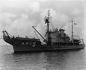 The ship was reacquired by the U.S. Navy on 17 April 1959 and commissioned in New York on 30 April 1959 as the Cable Repair Ship USS Yamacraw (ARC-5), 30 April 1959. Yamacraw was assigned to the 3rd Naval District for the next six years. She operated from Portsmouth, New Hampshire, to Bermuda and spent much of her at-sea time conducting research projects for the Office of Naval Research (ONR) and for the Bell Telephone Laboratories.[3] The ship, operated by Bell Telephone Laboratories, was identified as one of nine military research and development oceanographic ships in a 1959 National Academy of Sciences report.[14]