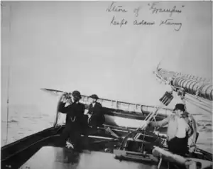 - ↑ NOAA Photo Library No caption. Perhaps a dependents cruise on the Bureau of Fisheries schooner GRAMPUS. The GRAMPUS was condemned and sold in 1918.