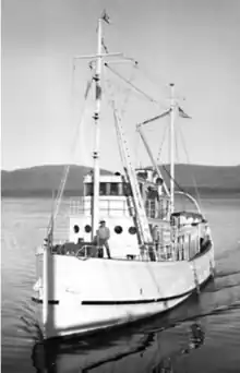 As late as 1947, Brant remained in use in the FWS fleet as a base of operations for surveying streams; in this role, she served as the mother ship for small FWS skiffs powered by outboard motors which operated in shallow water both to identify obstructions in streams that could interfere with the spawning journeys of salmon and to transport FWS personnel to and from shore.[2] In the 1950s her original engine was replaced by a new 240-horsepower (180 kW) Union diesel engine manufactured at Oakland, California, in 1951 which on average consumed 800 US gallons (3,000 L; 670 imp gal) of diesel fuel a day, and her fuel tanks had a capacity of 4,000 US gallons (15,000 L; 3,300 imp gal).[2] By that time, her main engine and propeller controls were located in her engine room, as were fire and bilge pumps and a battery bank.[2]