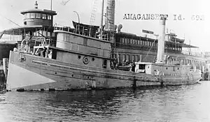 ![]() Amagansett as a commercial fishing trawler, probably around the time the United States Navy acquired her for service as the patrol vessel and minesweeper USS Amagansett (SP-693) in May 1917. The ferry Castleton is in the background. | |