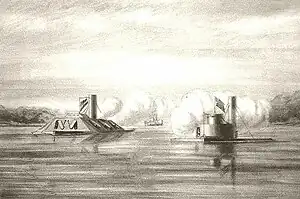 A drawing of USS Weehawken capturing Atlanta, 17 June 1863