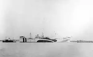 ![]() SS Berwyn photographed off the Bethlehem Shipbuilding Corporation's Bethlehem Sparrows Point Shipyard at Sparrows Point, Maryland, on 26 September 1918 at the time of her completion, two days before her acquisition by the United States Navy. She is painted in dazzle camouflage. | |