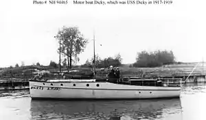 Dicky was built as a civilian motorboat of the same name in 1913 by the Weckler Boat Company at Chicago, Illinois. The U.S. Navy leased her from her owner, C.N. Steele of Waukegan, Illinois, in April 1917 for World War I service as a patrol vessel. She was commissioned in mid-June 1917 as USS Dicky (SP-231).