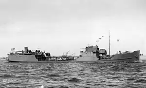 The Navy identified a need for shallow draft tankers to support operations in shallow Mediterranean ports to support the advances in that area. Veedol No. 2 was one of three tankers specifically identified for purchase and limited conversion to arm the ships and provide crew quarters the Navy crews.[7] On 22 March 1943 Veedol No. 2 was requisitioned by the War Shipping Administration (WSA) for wartime service at Bayonne, New Jersey and simultaneously delivered to the Navy as purchaser of the vessel.[8] The tanker was converted at Brewers Drydock, Staten Island and commissioned as Guyandot 17 April 1943.[3]