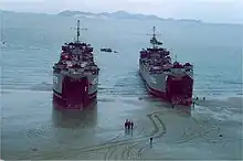 Kent County (LST-855) and St. Clair County beached at Baengnyeong Island, Korea, in December 1953.