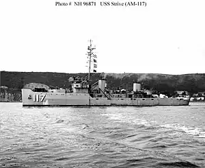 USS Strive (AM-117) was an Auk-class minesweeper acquired by the United States Navy for the dangerous task of removing mines from minefields laid in the water to prevent ships from passing.