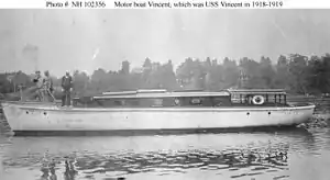 Vincent was built as a civilian wooden single-screw cabin motorboat of the same name in 1909 by Britt Brothers at Lynn, Massachusetts. The U.S. Navy acquired her under a free lease from her owner, the Transfer Company of Norwich, Connecticut, for use as a section patrol boat during World War I; sources differ on the date of the acquisition, suggesting that it could have happened in both June 1917 and June 1918.[1] She was commissioned as USS Vincent (SP-3246); sources disagree on her commissioning date, stating that it was 28 June 1917,[2] 20 June 1918,[3] and 28 June 1918[4]