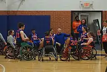 The Lady Movin' Mavs were initially a sports club at UTA and transitioned to full intercollegiate team status once sufficient funds had been raised.[7] It plays under the auspices of the National Wheelchair Basketball Association (NWBA), which organizes intercollegiate wheelchair basketball tournaments across the United States. During the 2014–15 season, the team's roster grew from five to nine players, which allowed the team greater flexibility with strategy and opportunities to rest players.[8] That season, the team played in the National Intercollegiate Wheelchair Basketball Tournament (NIWBT), where it lost to the University of Illinois in its first game and then lost to the University of Wisconsin–Whitewater in the third-place game.[9]