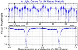 ![]() A visual band light curve for UX Ursae Majoris, adapted from de Miguel et al. (2016).[1] The top plot shows the variation over several weeks, and the bottom plot shows the mean light curve over one orbital period. | |