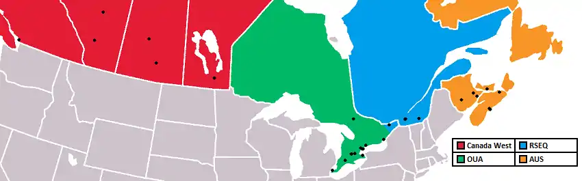 In the U Sports regular season, 36 teams play between 20 and 28 matches in their respective regional conferences. At the end of the season, qualifying rounds (in each regional conference) determine the champion team in each of the four Canadian regions. Afterwards, a national tournament takes place consisting of eight teams: the winning team in each of the four regional championship conferences; (Atlantic University Sport, Quebec Student Sports Federation (in French, Réseau du sport étudiant du Québec), Ontario University Athletics and Canada West Universities Athletic Association). In addition, the organizing team of the national tournament (the university which hosts the annual event) and the defending champion, as well as the finalist from all four conferences qualify.