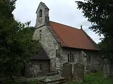 The village has two churches. Situated on a hill to the north of the village is the old parish church of St Marys which is locally referred to as the Chapel. The oldest part of the building has been dated back to the 13th century but only the chancel of the original building now remains, to which a western porch has been added. There remain some ancient stained glass in the windows and some encaustic tiles in the floor.[9] The font, of the 15th century, has an octagonal bowl with a moulded lower edge, and a plain stem. In the bowl one of the two staples remains.[10] The memorials are to the knights of Barrells Hall and a coloured memorial to Sir Francis Throckmorton who died in 1554.[9]