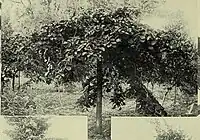 A weeping elm in the Hortus Botanicus Leiden was described there by the curator in 1890 in a Sempervirens article as an Ulmus americana Pendula, one of the synonyms of 'Scampstoniensis'.[9][31] It was carefully distinguished by him from two forms of weeping wych elm nearby, and was said to produce, in addition, vigorous ascending branches that needed regular pruning to maintain a tidy weeping shape. Three weeping elms were later photographed in the Hortus c.1920,[32] two of them forms of weeping wych, the third a semi-weeping elm with smaller leaves and numerous long shoots, many ascending, that appears at one time to have been pruned: by process of elimination, the Ulmus americana Pendula ('Scampstoniensis') of the 1890 Sempervirens article.[33] The c.1920 tree, though mature, closely resembles the 1859 illustration of a young 'Scampstoniensis' in New York, while a 1931 Ulmus americana pendula herbarium specimen from Leiden matches the 1902 Späth 'Scampstoniensis' specimens held in RBGE.[21] The 1890 article had expressed doubts about the name Ulmus americana Pendula; the c.1920 photograph labels the tree U. scabra [our U. glabra] pendula, despite its differences from the two weeping wych clones. The herbarium of the Naturalis Biodiversity Center in Leiden holds leaf specimens labelled "U. carpinifolia 'Pendula' (formerly called U. glabra Hudson 'Scampstoniensis')", from a tree in the Wageningen Arboretum.[34][35]